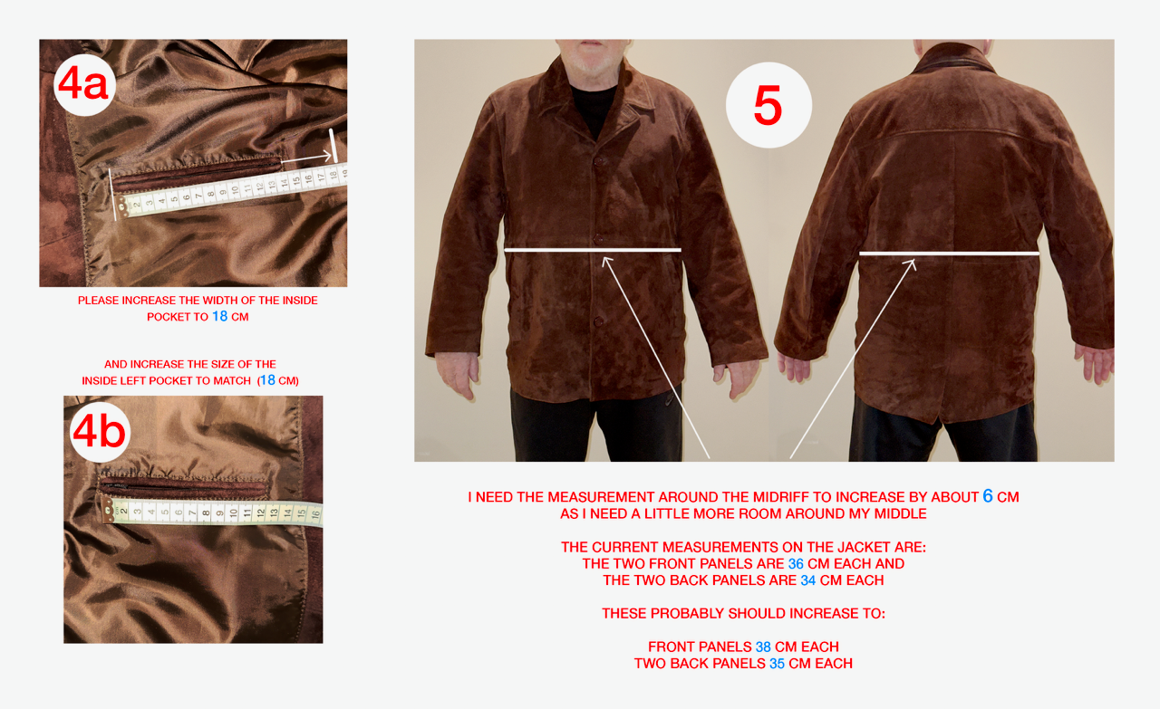 1:  Increase the length of the jacket and remove the vent at the back  (see details on the picture)